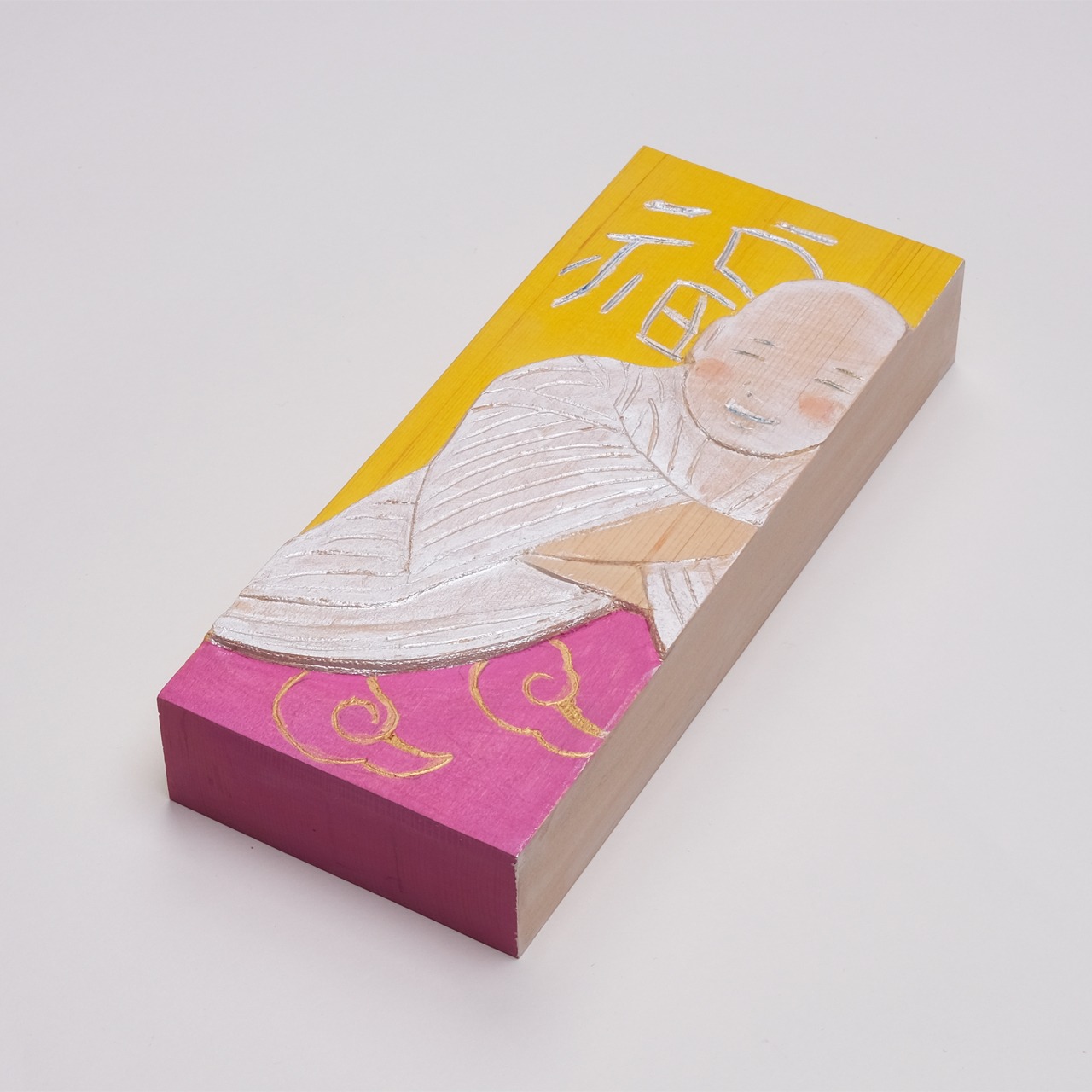 書道の美と技法を現代アートのなかへ吹き込む活動をしている、開田智氏による仙台四郎像です。墨汁と紙が引き起こす偶然性を援用しながら自らのイマジネーションを表現する、そんな新しい「書」の魅力を、制作拠点の富山から全国へ発信している彼女。仙台四郎展のため、このモチーフの伝説と特異性を巧みにとらえながら、「表札」用の木曽檜材を用いた半立体作品を制作しました。7点シリーズで、どれもが1点限りのものです。刻書の技術を応用し彫刻刀で丁寧に掘り、ラッカー仕上げも施したユニークな仙台四郎像。小さいながら、和洋問わずお部屋に合う格調高い作品になりました。飲食店の座敷やカウンター内など様々な場に、またプレゼントとしてもすぐお役立ていただけます。